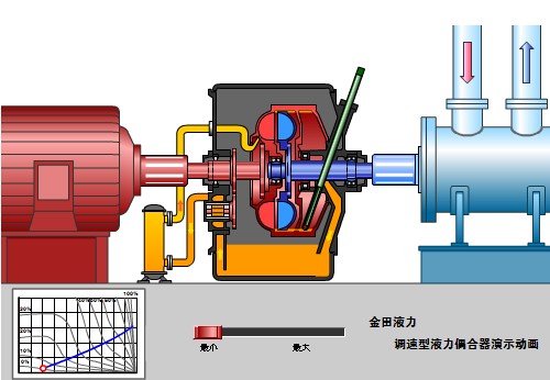 調(diào)速型液力偶合器之所以能夠調(diào)速,是通過偶合器內(nèi)部的導(dǎo)管改變導(dǎo)管開度,從而改變工作腔內(nèi)工作液的充滿度,在電動機(jī)轉(zhuǎn)速不變的情況下,實(shí)現(xiàn)對工作機(jī)的無級調(diào)速,改變輸出功率的大小。因在傳遞能量變化時,產(chǎn)生轉(zhuǎn)差率,會使工作液發(fā)熱,所以必須配備冷卻器把工作液冷卻。偶合器配備有電動執(zhí)行器和電動操作器,與負(fù)載變化的訊號聯(lián)接,也可按用戶要求配自動測速裝置。可以實(shí)現(xiàn)調(diào)速遙控或自動控制。